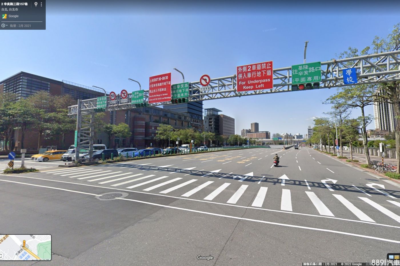 位於國道3甲端末的台北市辛亥路三段,是全台單一路名劃設最多車道的平面道路,包含東北向9車道和西南向8車道,共計17個車道。不過按前述公路之定義,由於該路段已非國道3甲路線之範圍,屬於市區道路而非公路。(圖/Google Maps)