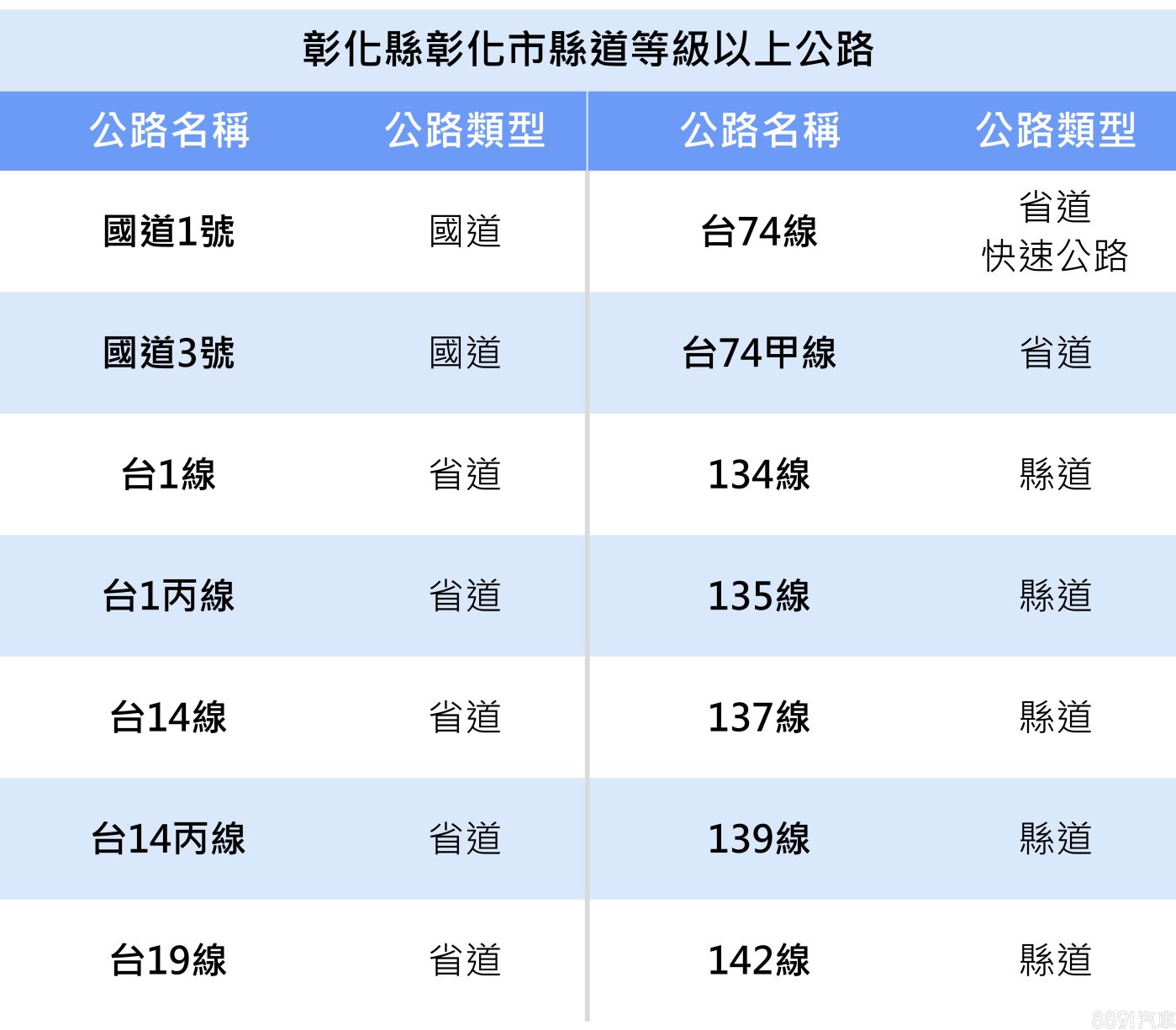 若只統計作為鄉鎮市間重要聯絡道路的「縣道」以上公路,則彰化縣彰化市為全台擁有最多縣道以上公路匯集的鄉鎮市級行政區,包含2條國道、1條快速公路、6條省道(含支線)及5條縣道,共計14條主要聯外公路位於轄區內。