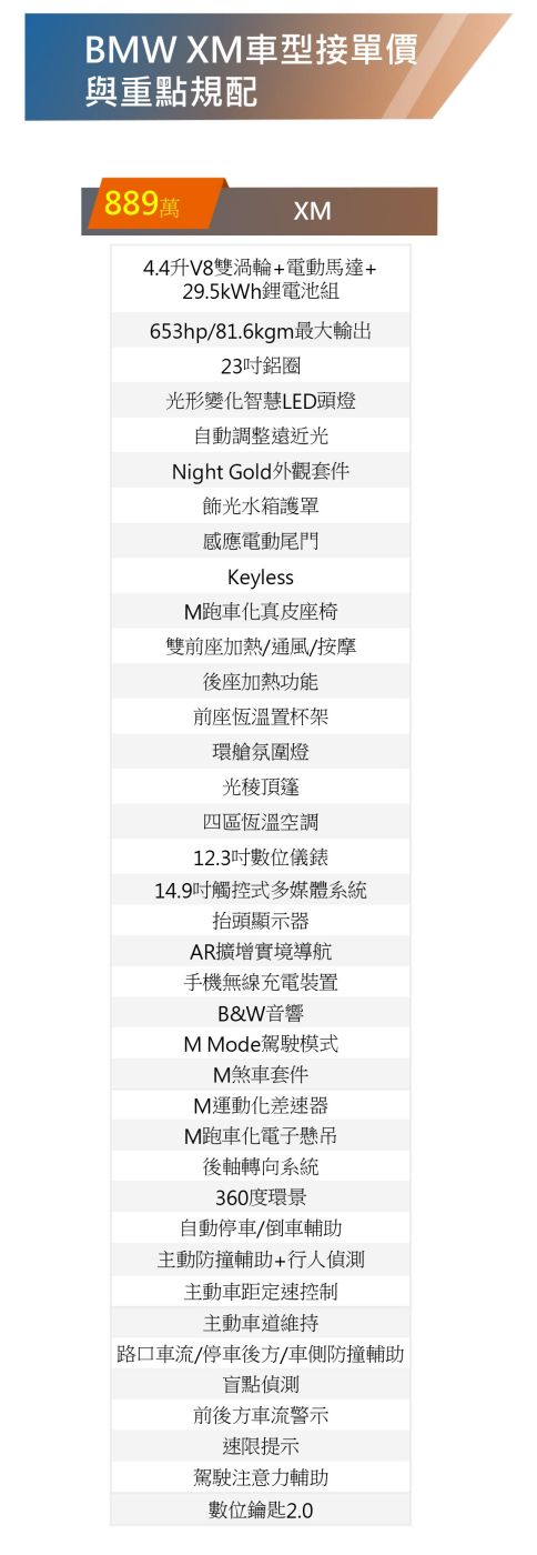 XM在國內提供單一車型,接單價為889萬,配備方面可說是好料盡出,外觀方面除了原本就極具張力的設計,更以Night Gold外觀套件、飾光水箱護罩、23吋鋁圈等彰顯氣勢;內裝新世代招牌的12.3吋數位儀錶、14.9吋觸控式多媒體系統、AR擴增實境導航等也都沒少,重點規配如附表。