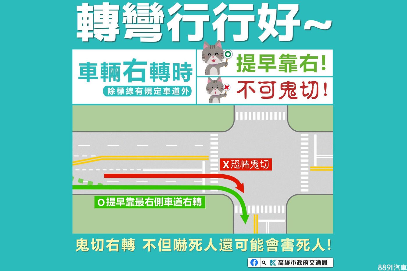 為何要求右轉車輛要先切到最外側車道?用意在於避免車流路線交錯。若車輛右轉時不在最外側車道,轉向時行車路線將與外側車道直行路線交錯,增加碰撞可能,就算明定轉向車須禮讓直行車,但做好路線劃分更能做到預防事故的效果。(圖/高雄市交通局粉專)