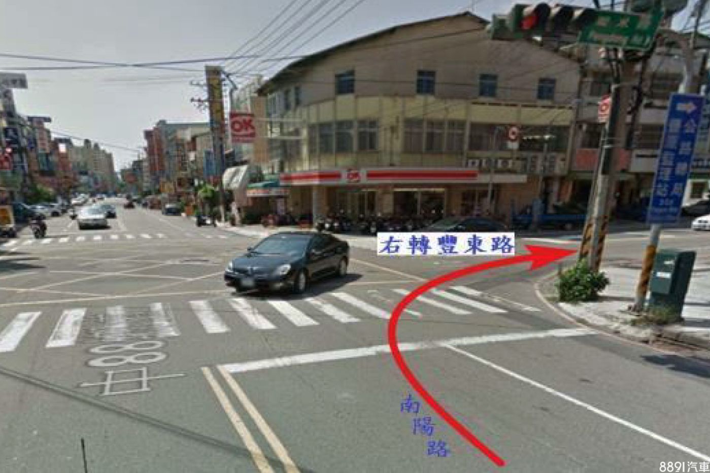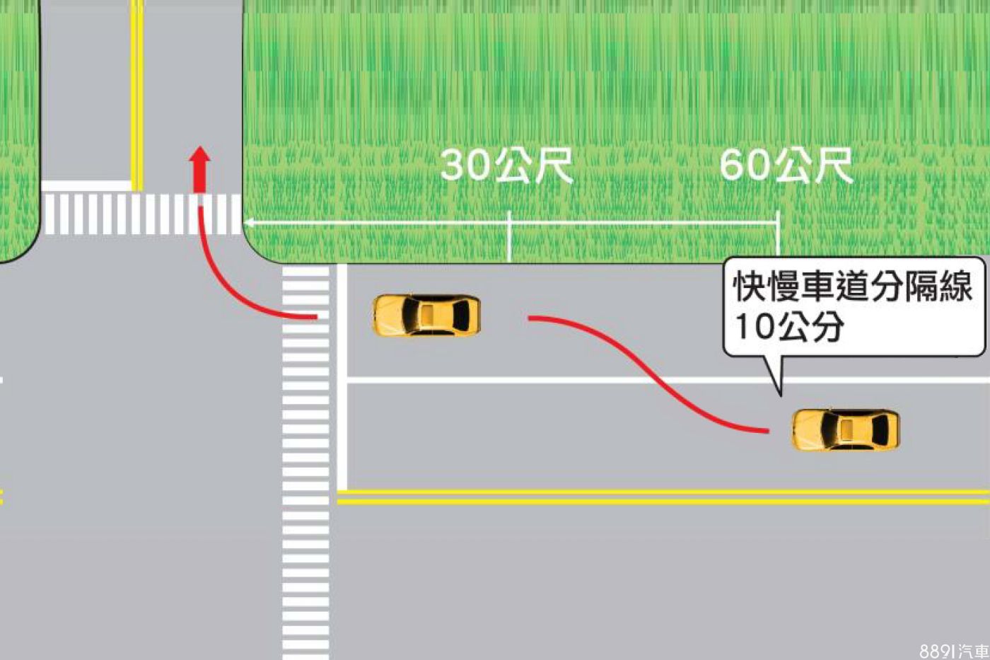 由於原規則中同時提及「外側車道」與「慢車道」兩詞,又同向三車道以上路段不易區分所謂「右側」車道,導致描述上可能讓用路人對「外側車道」的概念感到混淆,甚至有路考圖文說明以快車道右轉的標記來呈現。(圖/台中區監理所道路考驗圖文說明)