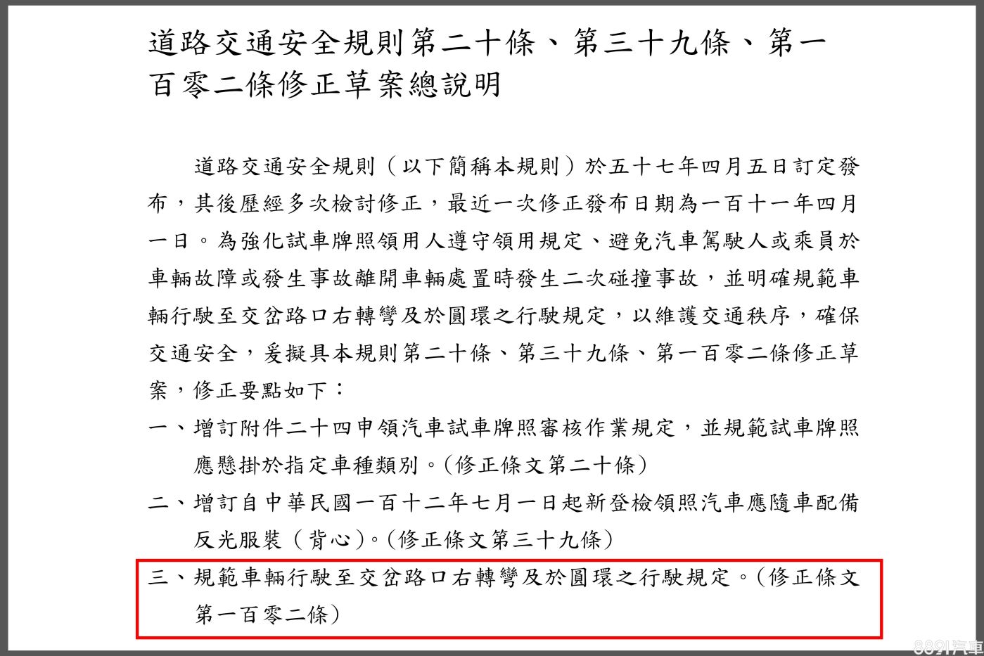 因此,在新版修正草案中調整了規則內文,將法條修改為「右轉前應於路口30m前換入『最』外側車道或右轉車道」,來降低原本描述所可能產生的誤解。