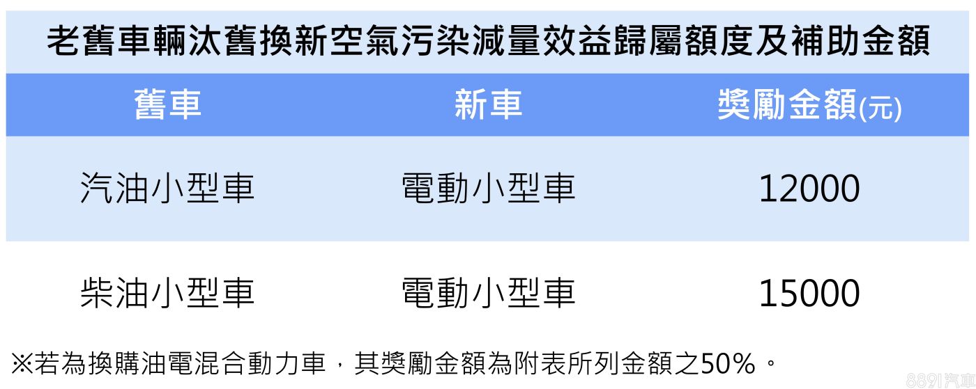 至於減碳獎勵則針對小型車所實施,汰舊指定年限以上之汽油車款並換購純電小型車,同樣若同意將碳權移轉環保署,則可獲1.2萬元獎勵金,柴油車款獎勵金則小幅增至1.5萬。同空汙補助,若換購車款為油電動力車型,則獎勵額度減半提供。
