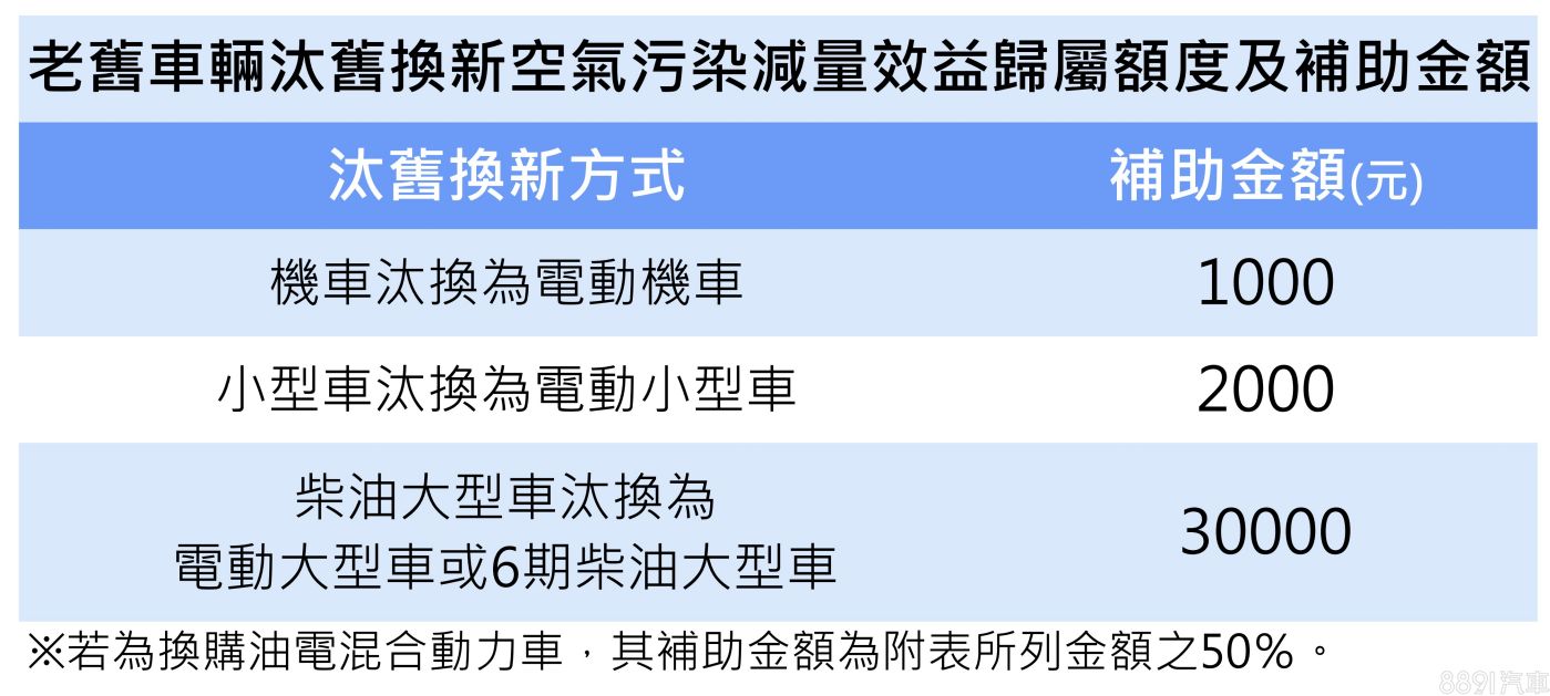 補助額度視換購車款而異。完成汰舊換購電動機車可獲1000元補助,小型車換購電動車則補助2000元;而柴油大型車若換購六期柴油或電動大型車,則可享3萬元補助額度。但若換購車款為油電車,則上述額度將減半補助。