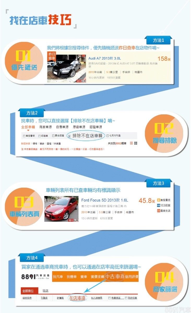 在此也提供「找在店車技巧」給各位讀者,除了根據搜尋條件,會優先提供在店物件外,也能夠透過搜尋條件,勾選排除不在店車輛,如果想以車商找車,我們也歸納出在店率高分類,讓你快速找到優質車商。