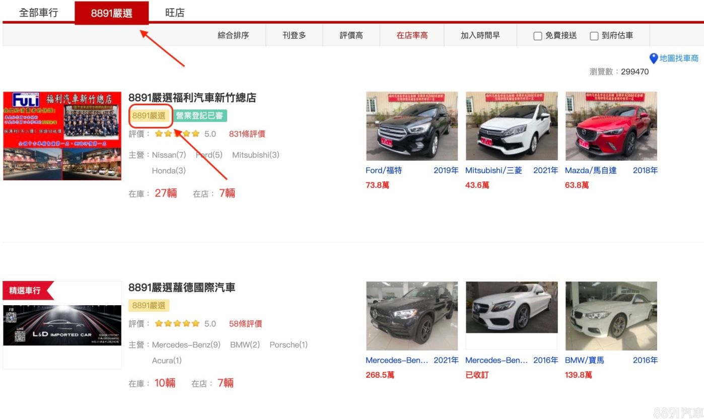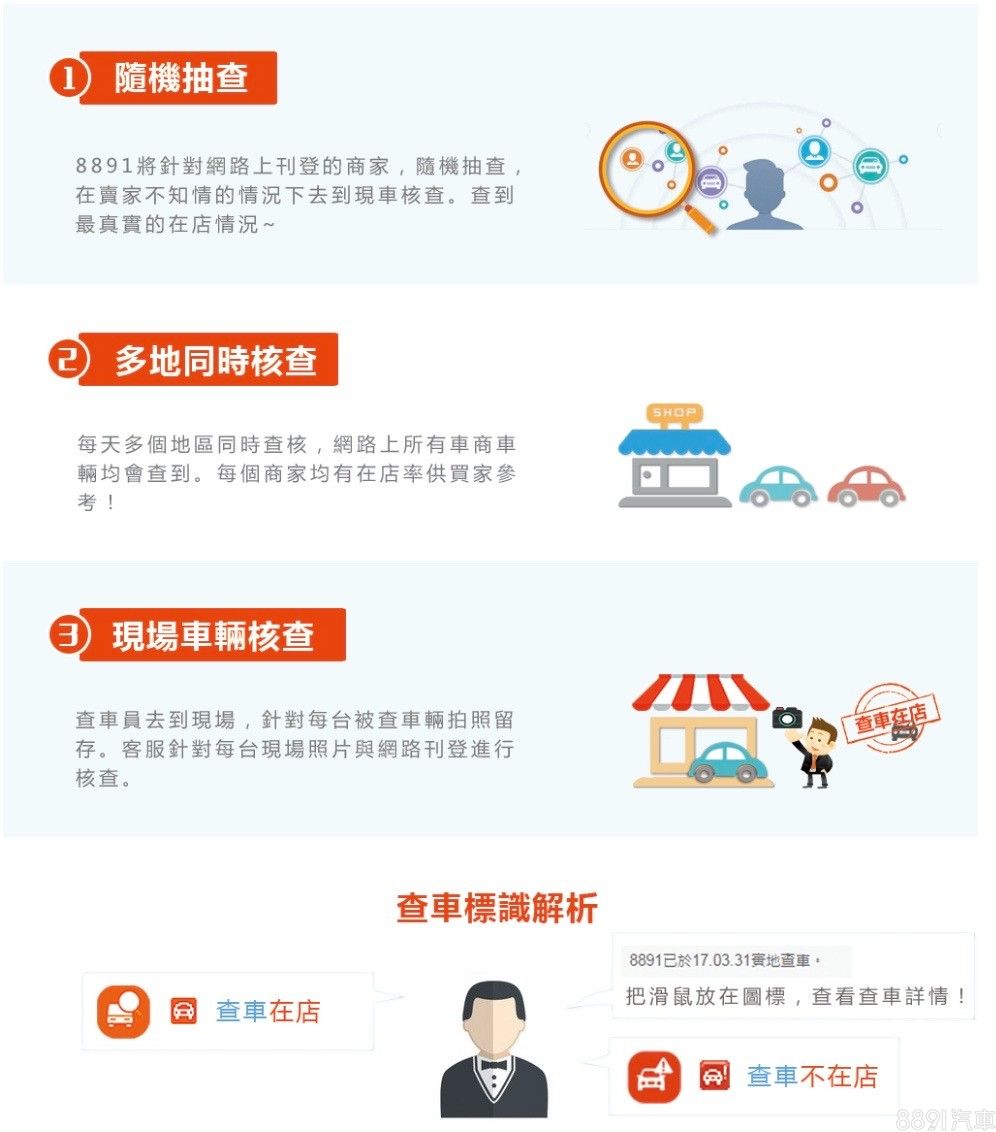 各位也要知道,嚴選專區並未向車商收取任何費用,簡單來說,車商們沒有任何捷徑可走,只有靠著誠信、時間累積,一步一腳印,來符合實車、實價、實況三大原則,才能被8891納入專區,各位中古車買家請安心服用。