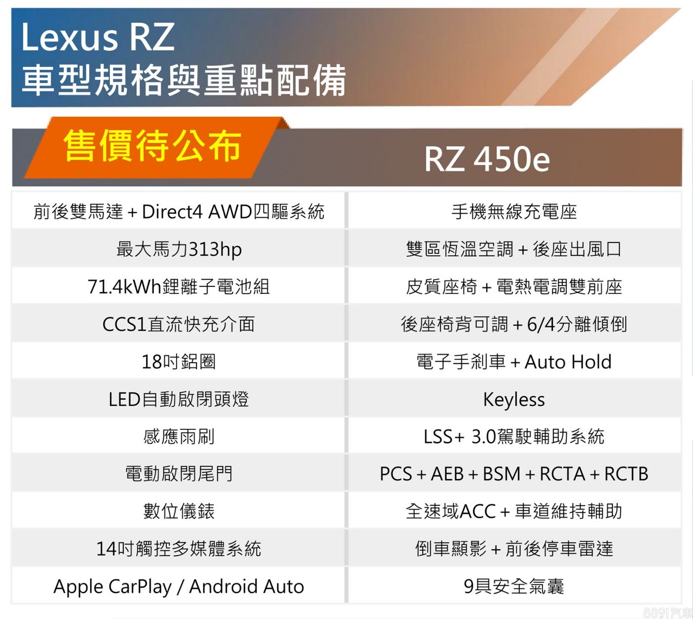 Lexus RZ是款純電休旅車系,車格介於NX和RX之間,外型流線犀利具有高辨識度。台灣方面曾於本月初舉辦快閃展示活動,並於稍早在官網公布新車規格,並預計採單一車型的編成策略。