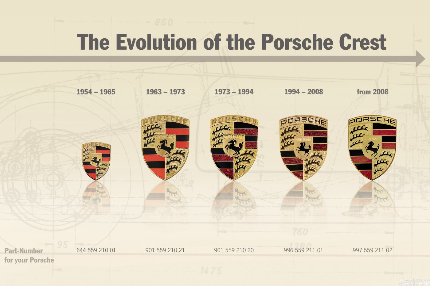 簡單回顧一下保時捷廠徽的歷史,最早於1952年出現,並在1954年全面普及於旗下車款上,設計概念大量取自保時捷的發源地,整個盾牌形狀與中間的躍馬都來自於斯圖加特的市徽,兩側的鹿角則取自斯圖加特市所在地:符騰堡-霍亨索倫地區的紋章,紅黑相間的圖案則象徵德國,先前共做了5次修改,現行使用的廠徽是2008年所推出。