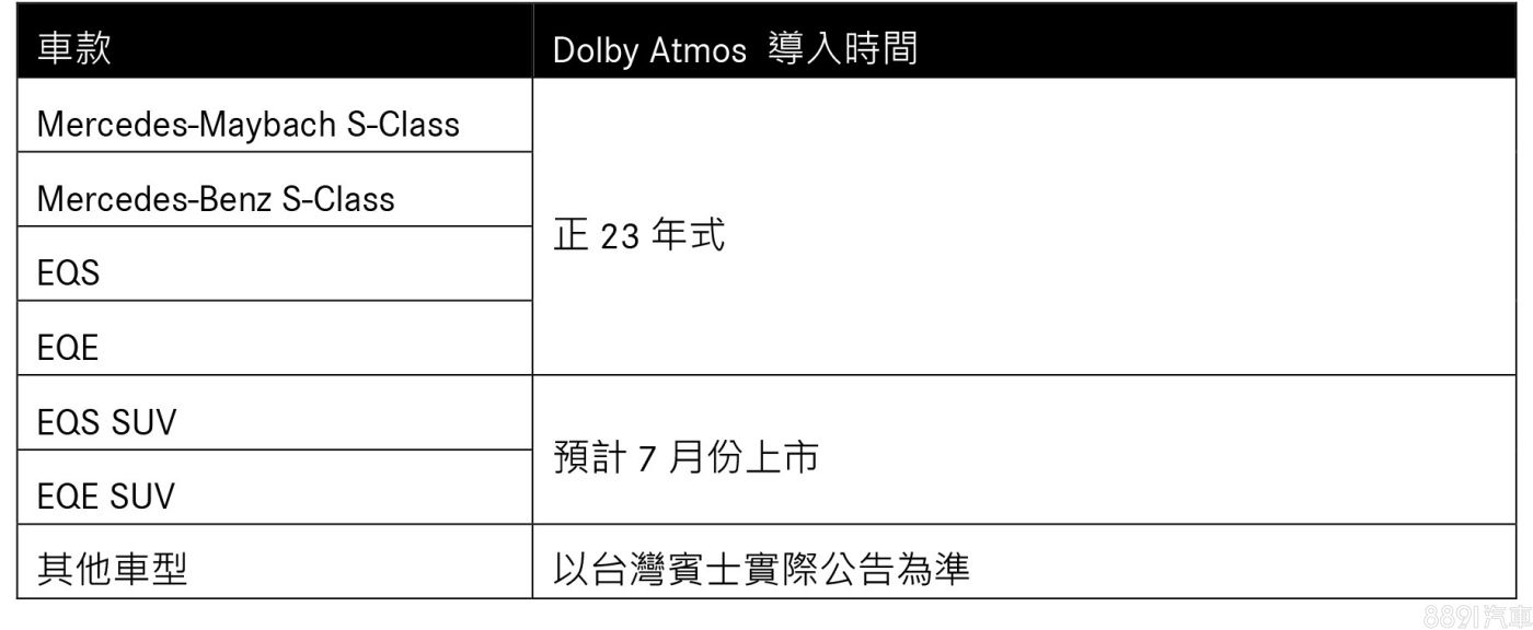 M.Benz將於自家車款上導入Dolby Atmos杜比全景環繞音效,是車壇首度以原音重現方式,提供Apple Music空間音訊杜比全景音效的非Apple裝置。台灣市場將率先搭載於2023年起生產的Maybach S‑Class、S-Class、EQS、EQE,以及預計於7月發表的EQS SUV與EQE SUV,其他車型則以台灣賓士實際公告為準。
