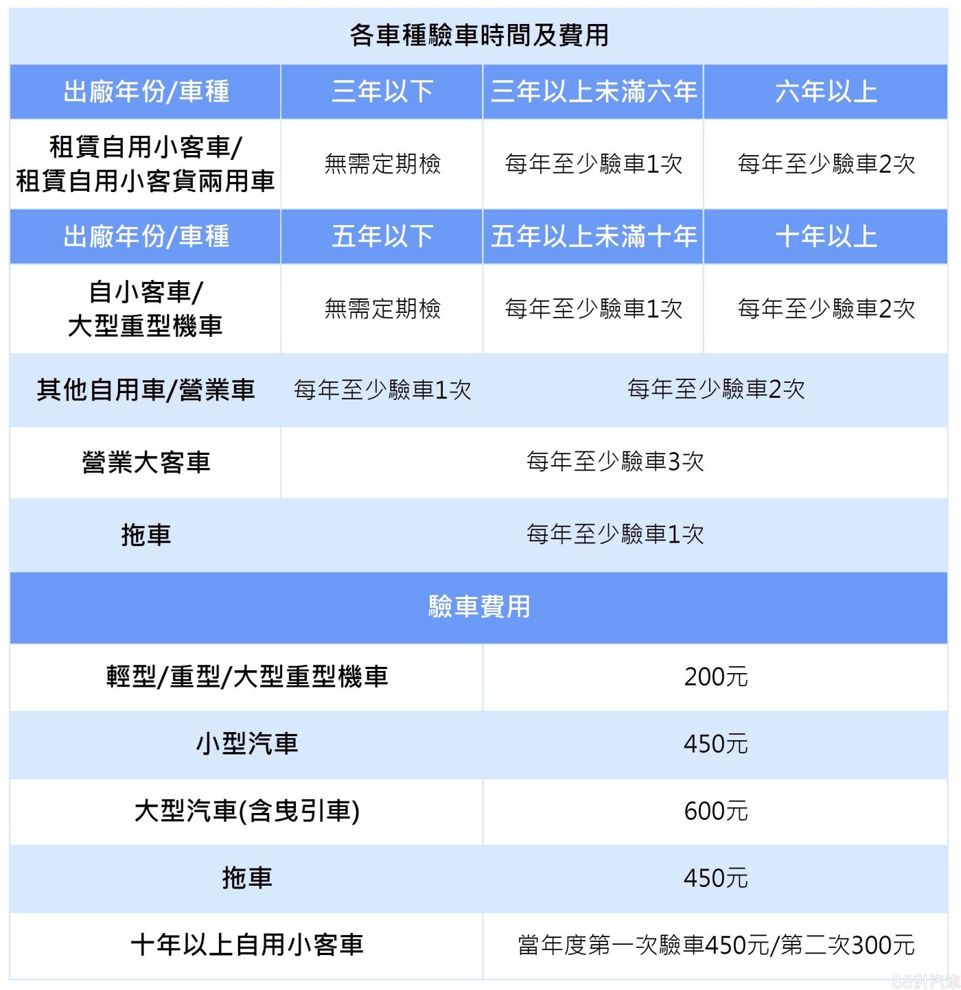 驗車時間及費用依車種而有不同,舉例來說,一般自小客車只要出廠滿5年,每年就至少得花450元驗車一次,若愛車已經是10年以上老車,車主就得勤勞點,一年至少驗車兩次,當年度首次驗車費用同為450元,不過第二次費用就會享有優惠降為300元。