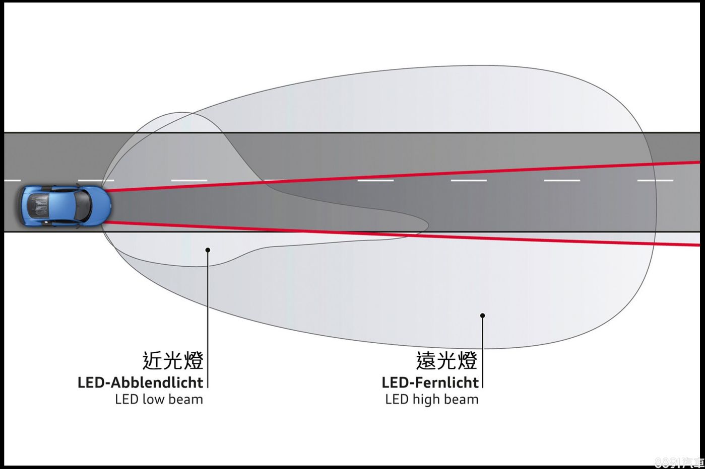 顧名思義,遠光燈和近光燈主要差在照射距離不同,這源自於光源亮度和照射角度不同:近光燈會朝地面打;遠光燈投射角度則較為上揚,同時光線也較強。此外,在光型部分,遠光燈的照射範圍,也會相較於近光燈更朝正前方集中。