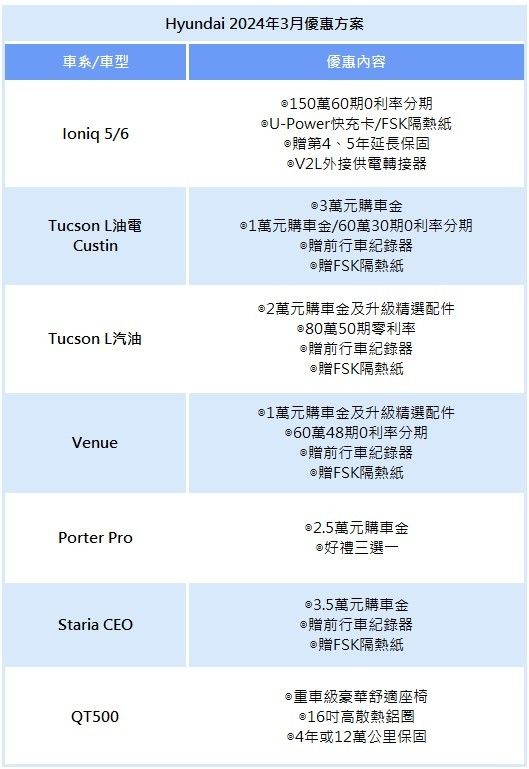 南陽現代本月入主部分車系,即送購車金、隔熱紙、行車紀錄器等好禮,電動車Ioniq 5、Ioniq 6及商車QT500也有專屬優惠。