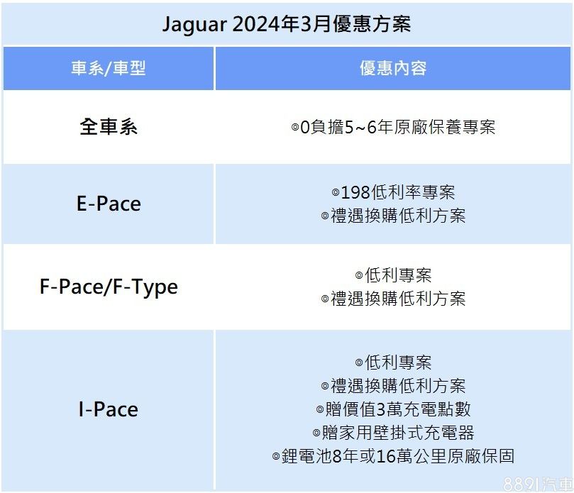 Jaguar 台灣捷豹路虎本月持續針對旗下全車系,推出0負擔6年原廠保養專案及購車低利率方案,I-Pace再享有電動車專屬禮遇。