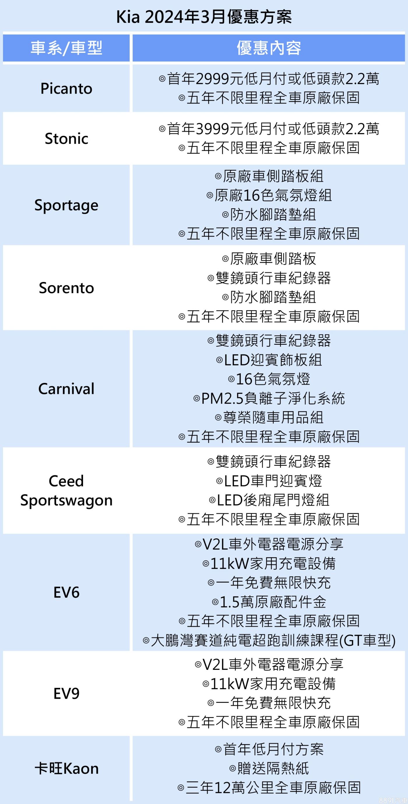 Kia 台灣森那美起亞本月持續針對眾多車系推出專屬優惠,部分乘用車款可享原廠保固、配件禮,電動車EV6、EV9也有專屬禮遇,商用車卡旺則享首年低月付方案及全車原廠保固。