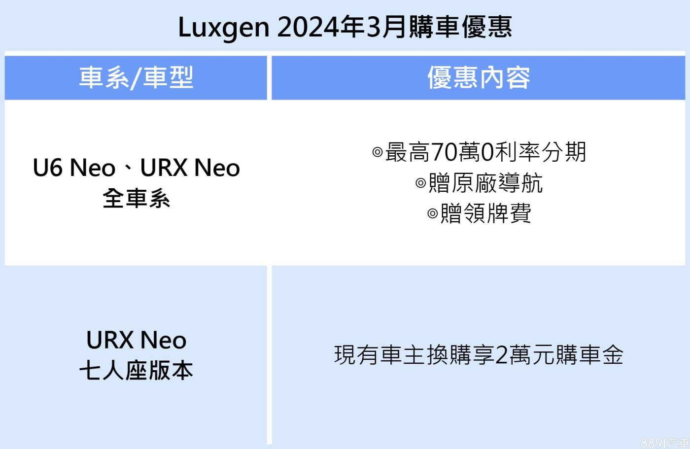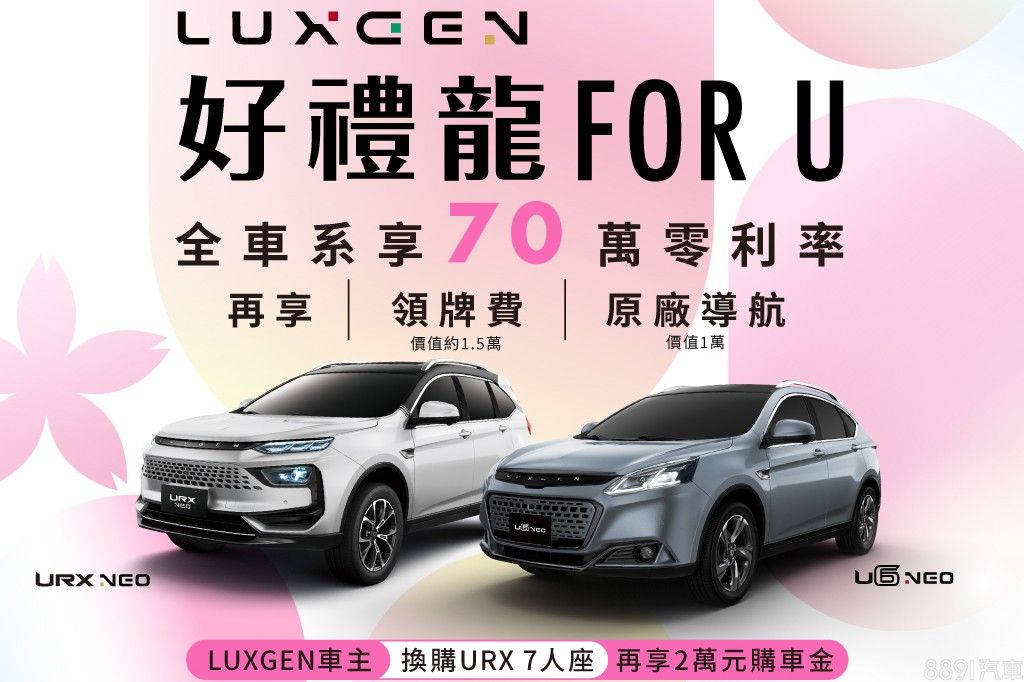 Luxgen Luxgen於本月推出「好禮龍For U」專案,自2024/3/1至2024/3/29止,入主URX Neo、U6 Neo全車系,最高可享70萬零利率分期,再送原廠導航(價值1萬),以及領牌費(價值約1.5萬)。