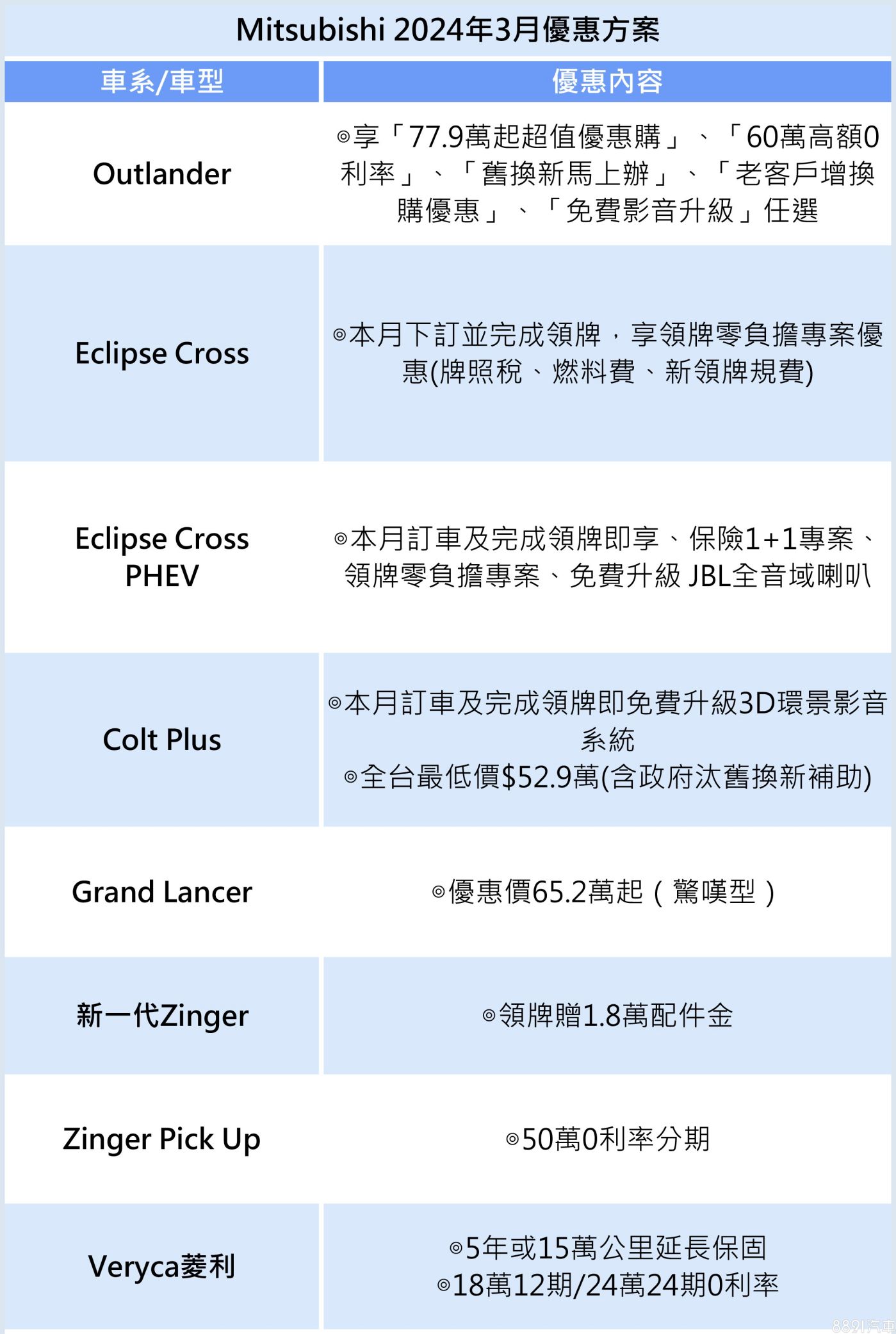 Mitsubishi 多車系延續舊換新優惠價、延長保固或0利率分期專案,新一代Zinger領牌送1.8萬配件金。於本月入主Outlander、Eclipse Cross PHEV、Colt享影音系統升級。