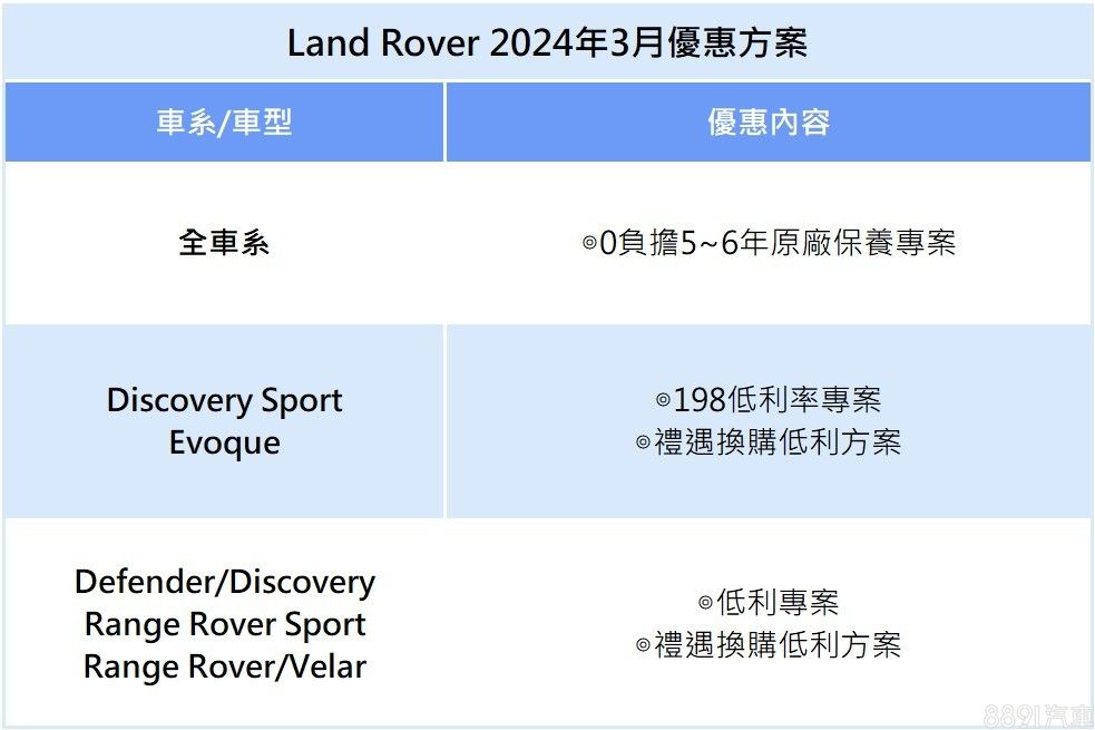 Land Rover 台灣捷豹路虎本月持續針對旗下全車系,推出0負擔6年原廠保養專案,指定車型再享購車低利率或換購方案。