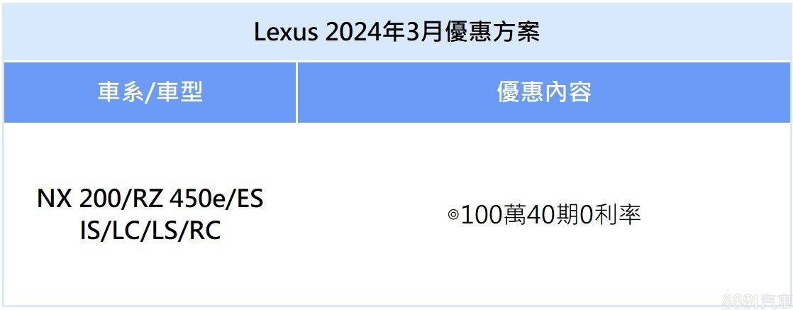 Lexus 除了LBX、RX、UX與LM車系外,Lexus本月持續針對全車系推出貸款優惠,提供100萬40期0利率分期專案,熱銷車型NX200與電動車RZ 450e也在促銷陣容內。