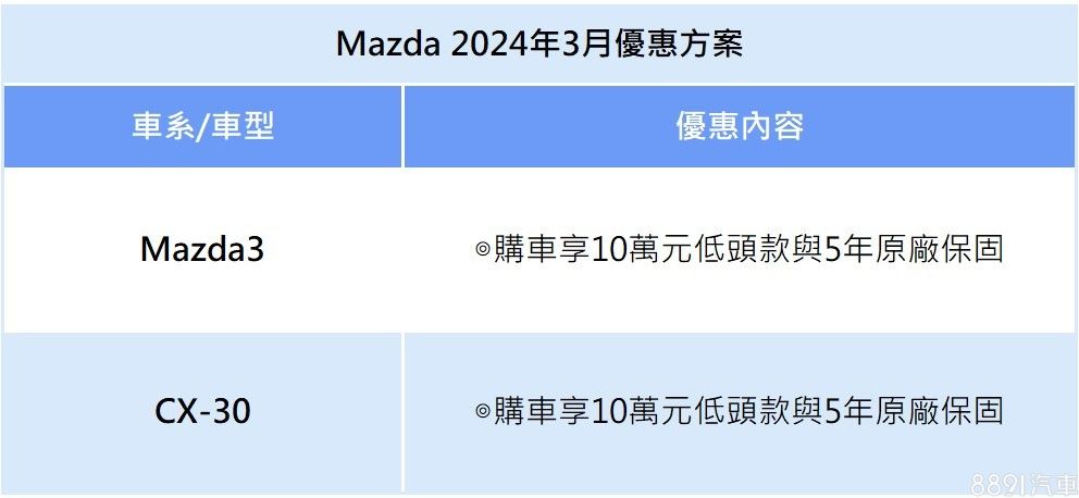 Mazda 於2024年3月入主Mazda3、CX-30兩款銷售主力車型,即可以「10萬元購車低頭款」輕鬆入主,同時再享「5年原廠保固」,讓車迷朋友安心享有暢意的擁車生活。