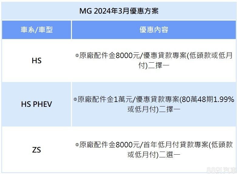 MG MG本月持續針對HS祭出輕鬆入主方案,網路購車即可享8000元~1萬原廠配件金或優惠貸款方案二選一,ZS也有原廠配件金8000元及優惠貸款方案可選。
