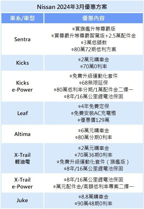 Nissan 裕隆日產本月針對Sentra推出升等優惠方案,還送配件金及低頭款方案。Kicks e-Power、X-Trail輕油電可免費升級運動化套件,Altima、X-Trail、Juke則享購車金及低利分期方案。