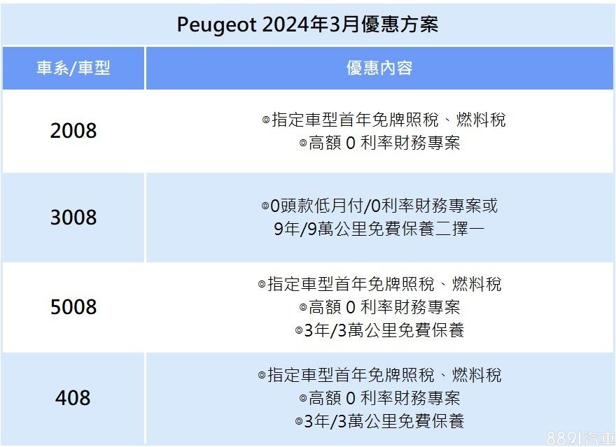 Peugeot Peugeot於3月份祭出最新購車優惠方案,2008、5008、408車型享首年免牌照稅、燃料稅優惠,全車再享高額零利率、免費保養方案。