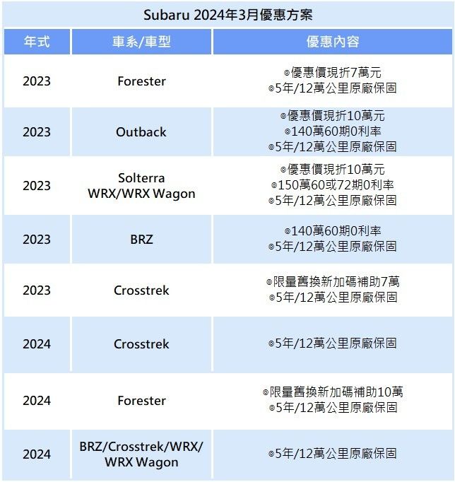 Subaru 速霸陸本月針對Outback、WRX、Solterra車系,2023年式車型祭出現折7~10萬優惠,另外還有高額分期、原廠保固方案。Forester、Crosstrek另提供加碼補助7萬優惠。