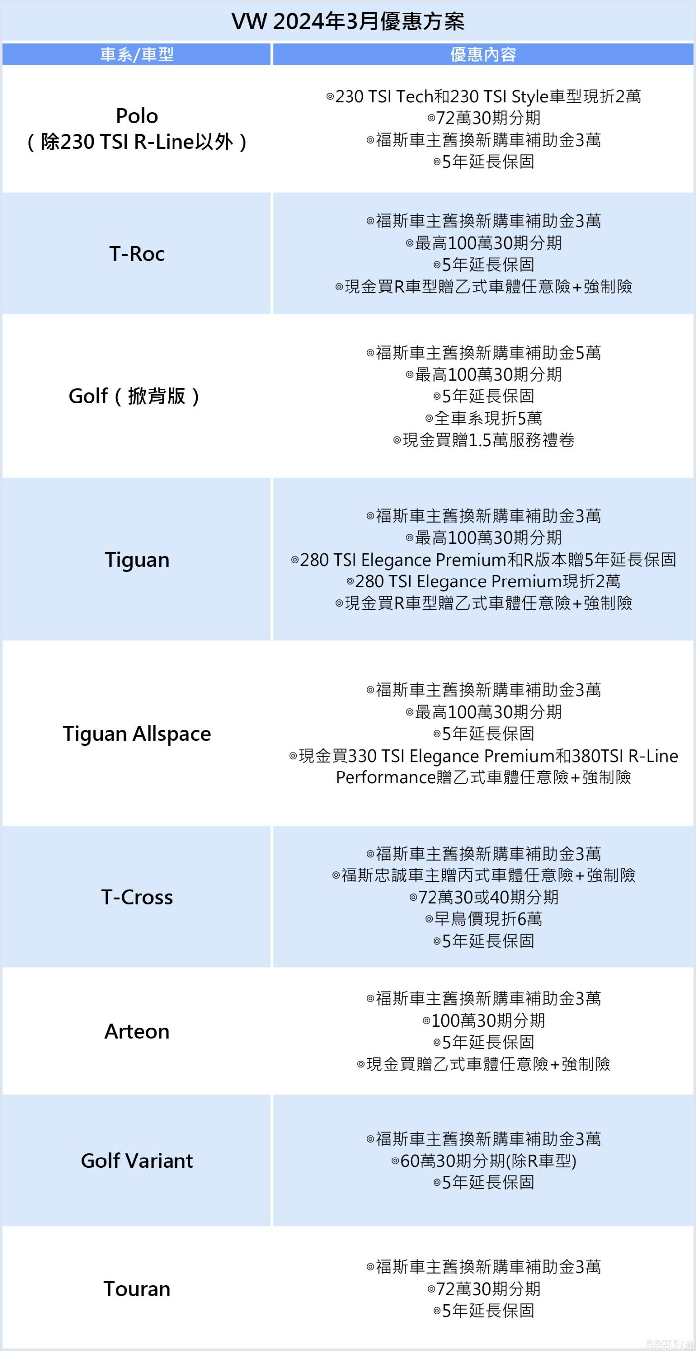 台灣福斯汽車本月針對Polo、Golf、Tiguan、T-Cross車系祭出最高折6萬現金優惠,此外眾多車系也推出專屬購車優惠,除福斯舊車主還可享有3萬購車補助金外,還提供高額0利率、免費第5年延長保固。