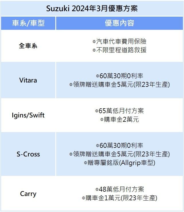 Suzuki 金鈴汽車本月全車系享有1~5萬不等購車金優惠(限23年生產),Vitara、S-Cross可享最高60萬30期0利率,Igins、Swift則有65萬低月付方案可選。