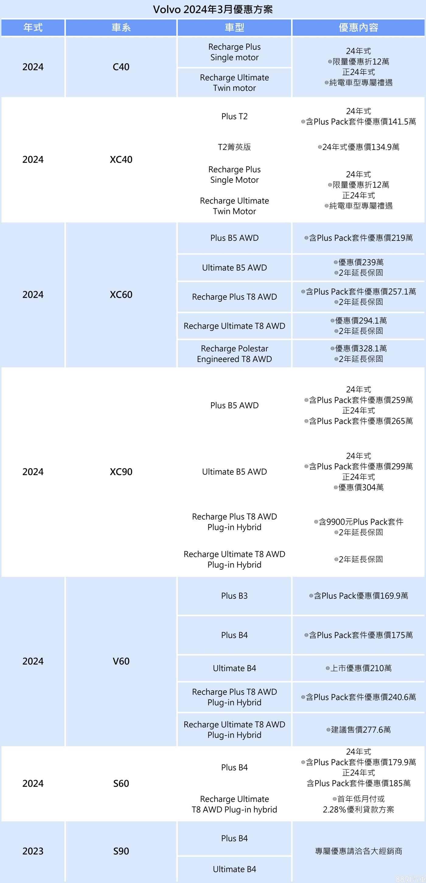 Volvo Volvo本月持續針對眾多車系推出專屬優惠,可享低頭款、超值購回方案或現金優惠價等,純電車型另享有專屬禮遇,部分新年式車型也推出上市優惠價。