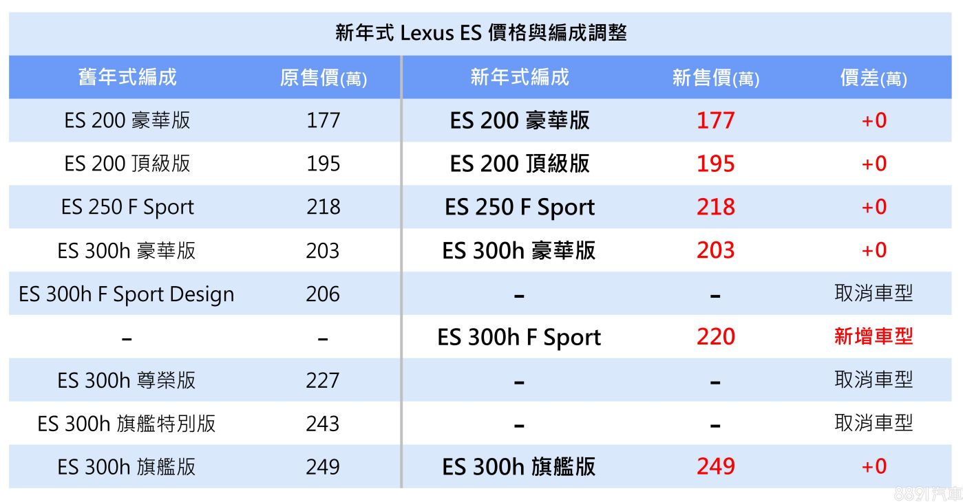 Lexus在台最暢銷房車ES,稍早上架新年式車型,主要針對車系陣容做調整,取消了F Sport Design、尊榮版和旗艦特別版等三款ES 300h車型,但編成追加220萬的ES 300h F Sport作為新選擇,其餘車型售價維持不變,因此車系價格帶仍落在177~249萬間。