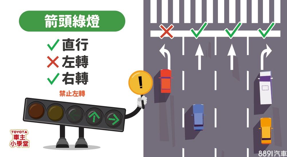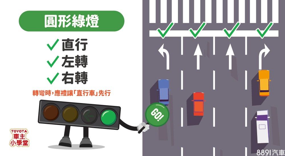 也許有人沒注意到,其實路上的紅綠燈也是有區別的,會依照該路口的車流狀況、甚至是離峰尖峰時間有所不同,簡單來說,就是「圓形綠燈任意轉、箭頭綠燈要注意」,如果是圓形綠燈,那就代表可以任意直行、左右轉,但若是「直行箭頭路燈」,那就算對向無來車,這時候也是不能左/右轉的,只能按照箭頭方向來行駛。(圖/Toyota車主小學堂)
