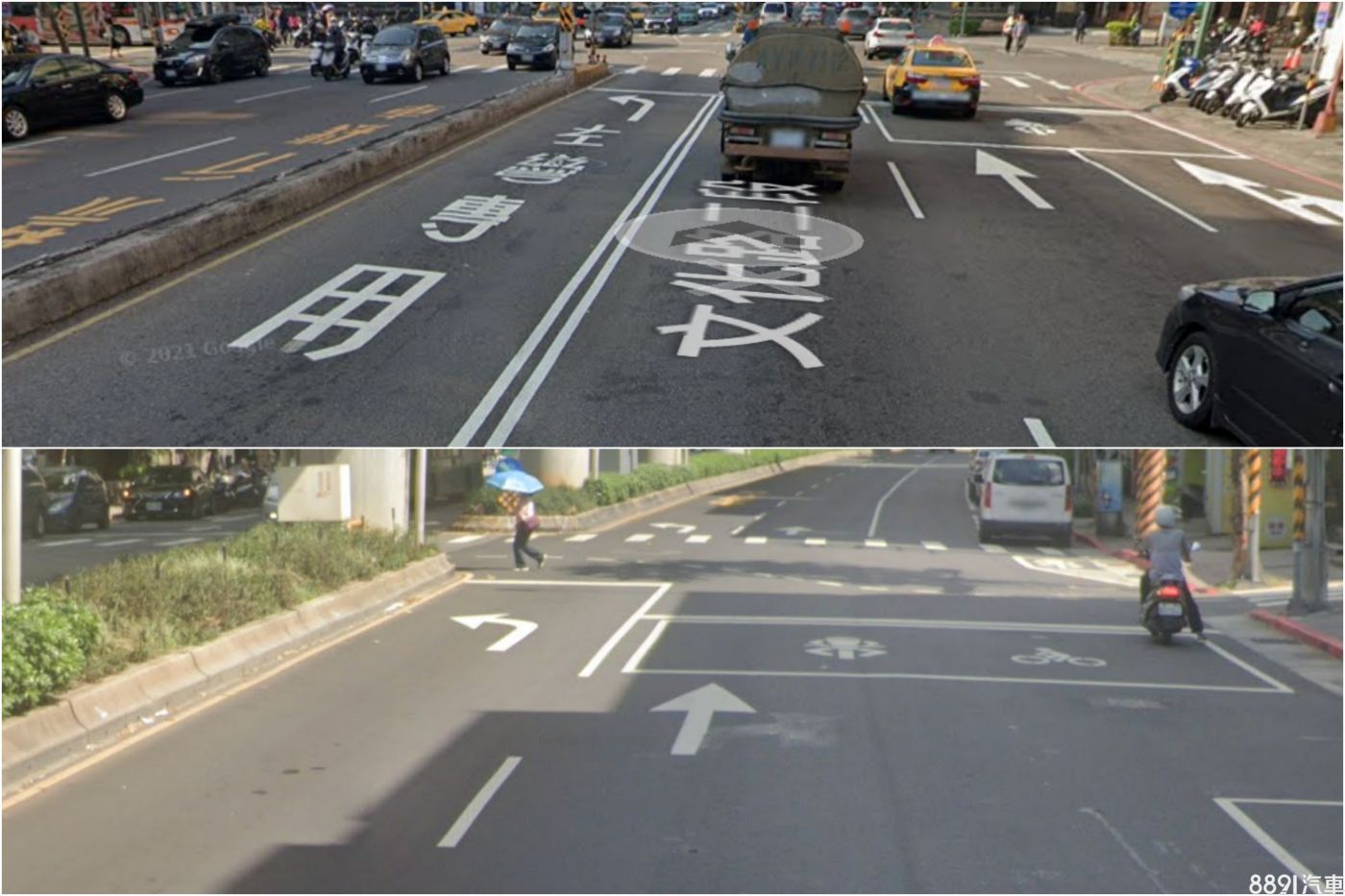 要分辨是否為左/右轉專用道,最簡單的就是看地上的白色箭頭,不過要注意的是,白色箭頭必須與禁止變換車道線配合使用(上圖),才會構成「左/右轉專用道」,如果只有左右轉箭頭卻沒有禁止變換車道線(下圖),其實是可以直行的!比較令人納悶的是,為什麼不直接畫一個結合直行與左右轉的箭頭就好?(圖/Google Maps)