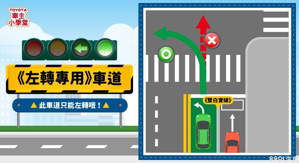 別以為只要是綠燈,直行都不會觸犯交通規則,許多道路因為車流量大,會設置「左/右轉專用道」,既所謂專用,就代表只能依照該車道規定的方向行駛,這也是許多人最容易違規的地方,有時候可能因為路不熟,在內線走著走著到最後一刻才發現居然是左轉專用道,雖然某一部分也可歸咎於道路設計的不良,但規定就是規定,如果在左/右轉專用道直行,會被罰600元!(圖/Toyota車主小學堂)