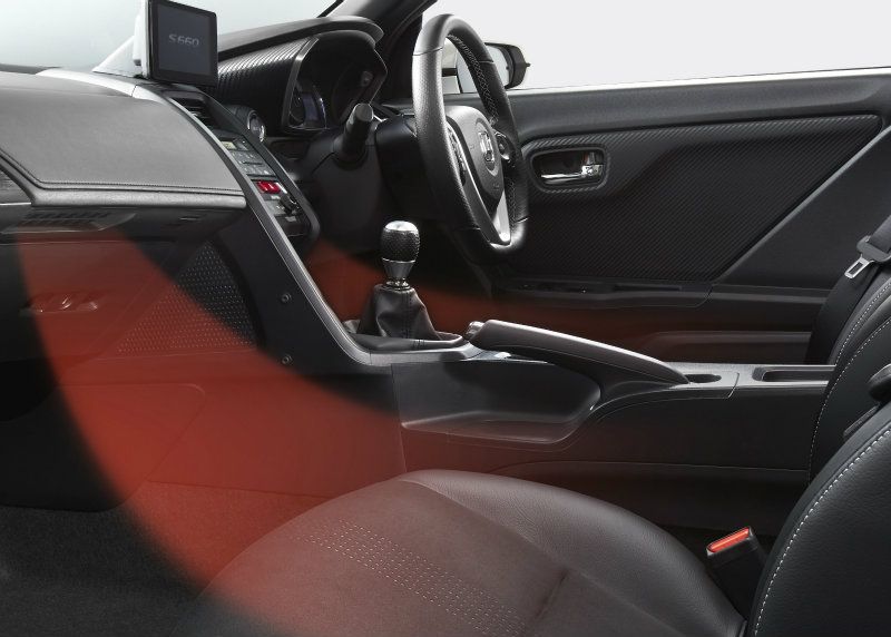 車艙座椅也以絕佳的操控導向為設計重點,無論是駕駛的坐姿、臀部支撐點以及油門與煞車的位置都經過精心計算,350mm直徑方向盤的尺寸也是Honda車系中最小的,營造有如駕馭go-kart的操駕感,讓人與車輛有如融為一體的絕妙感體驗。為了確保一年四季皆能享有最舒服的操駕環境,S660配置了全自動恆溫空調系統,並在腿部與腰部增設多向出風口,即便是開篷狀態也能享有舒適的行車環境。