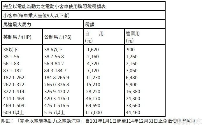 至於「牌照稅」部分,同樣維持免徵至2025年底不變。依照財政部目前公告:現行政府已將電動汽車和電動機車的牌照稅免徵延續至114年12月31日,未來如恢復電動車徵收,依使用牌照稅法第六條將電動車以馬達最大馬力為標準,課稅金額如表。