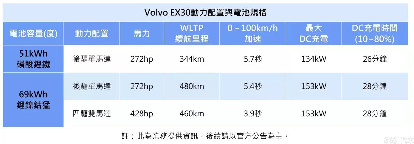 EX30有兩種動力配置,單馬達後驅有51kWh及69kWh兩種電池容量規格可選,最大輸出同為272hp,WLTP續航里程各為344km與480km,而雙馬達四驅統一搭配69kWh電池規格,最大出力來到428hp,原廠公布0~100km/h加速3.9秒,不過續航力也下降至460km。