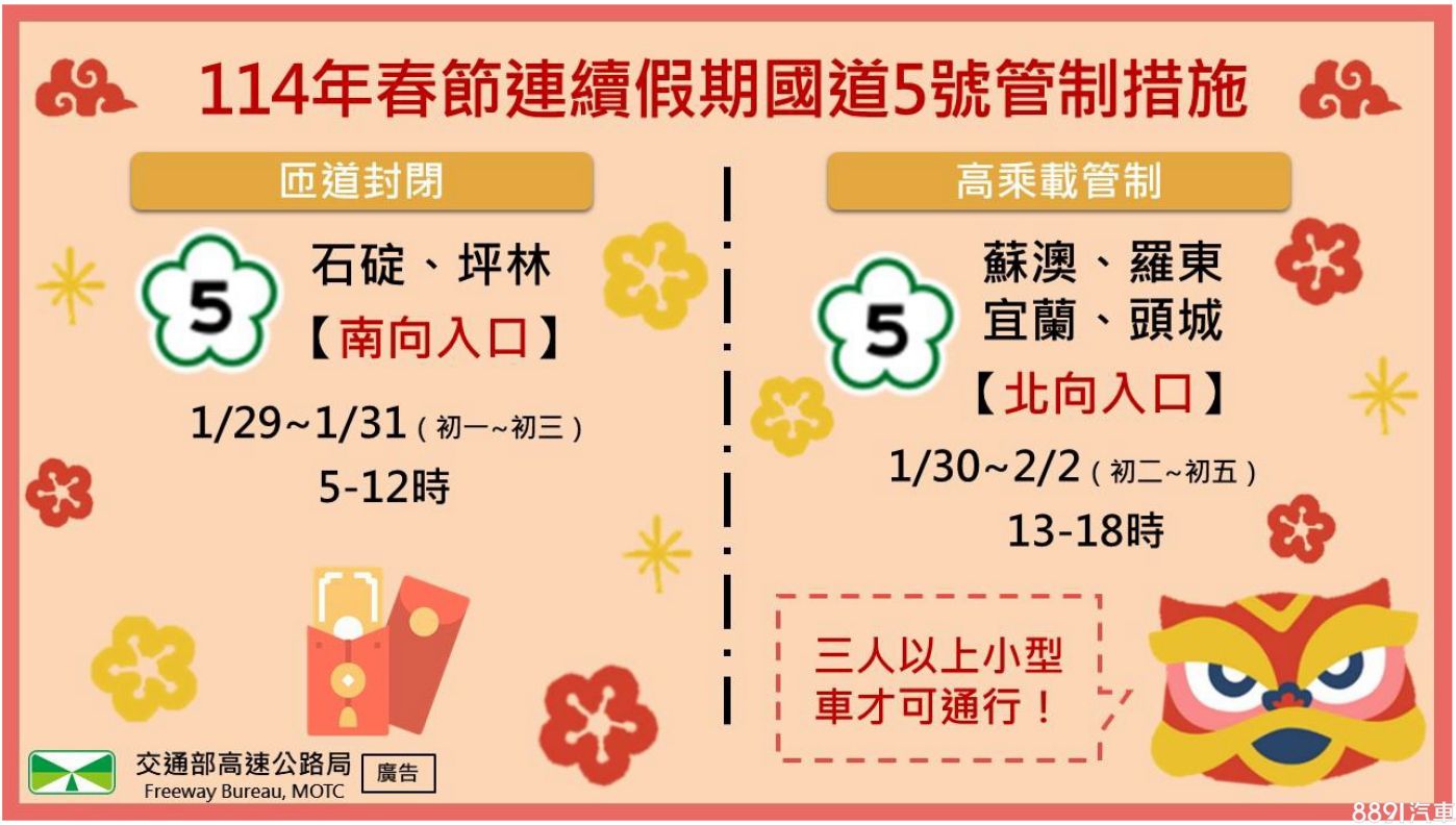 國道5號則計劃在初一~初三5~12時封閉石碇和坪林之南向入口匝道,並安排在初二~初五13~18時,於蘇澳、羅東、宜蘭、頭城四處北向入口實施高乘載管制。