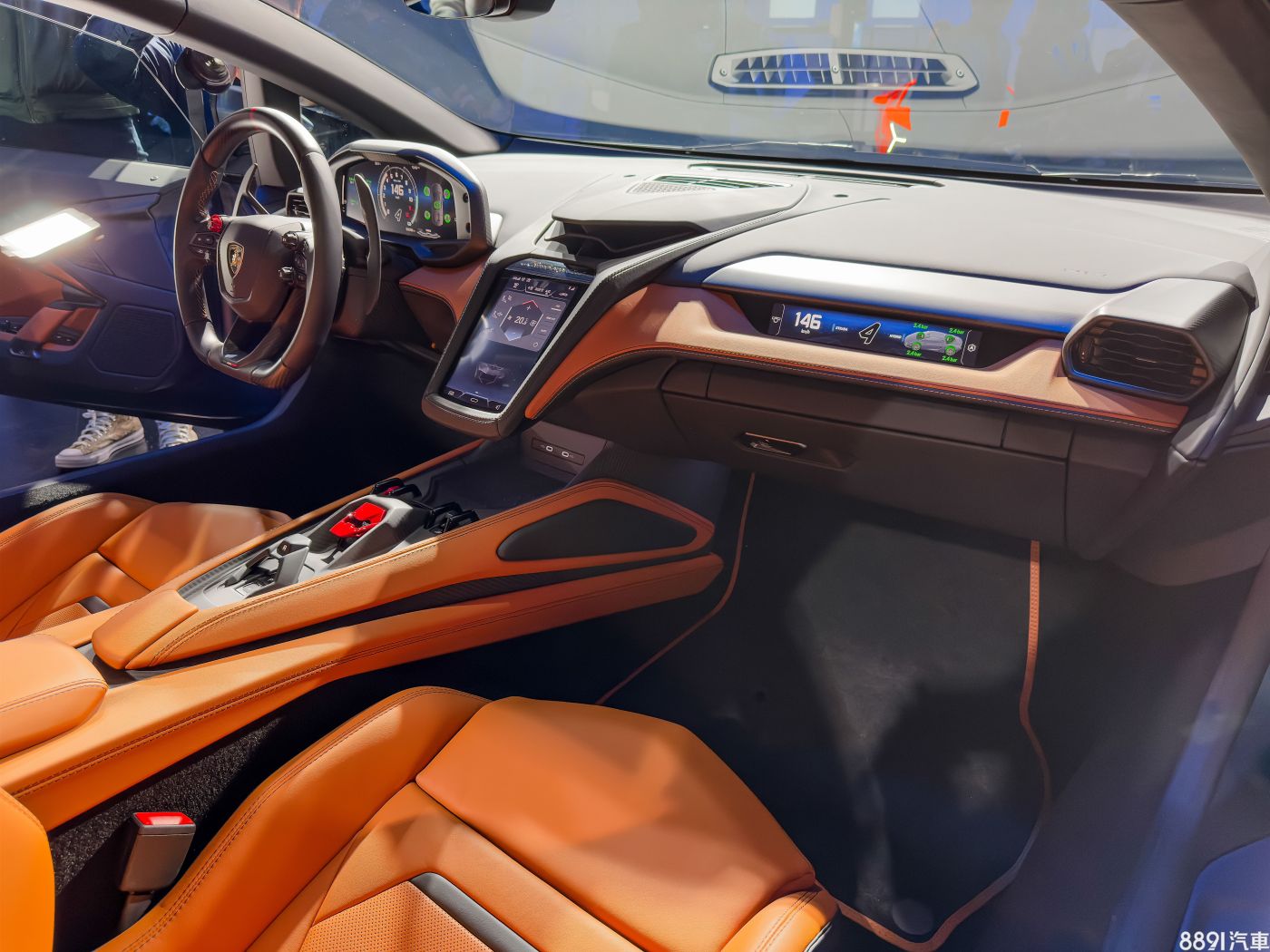 這台車的重點就是從Huracan的5.2升V10自然進氣引擎轉變為4.0升V8雙渦輪引擎搭配PHEV插電式油電系統,在引擎部分就有800hp/74.4kgm的輸出,搭配三顆最大功率各150hp的電動馬達,共同帶來上看920hp的綜效馬力峰值。其中兩顆馬達負責驅動前軸,也幫新小牛實現四驅配置,另一顆馬達則置於引擎和8速DCT自手排之間,除了提供動力外,也充當啟動發電機使用。