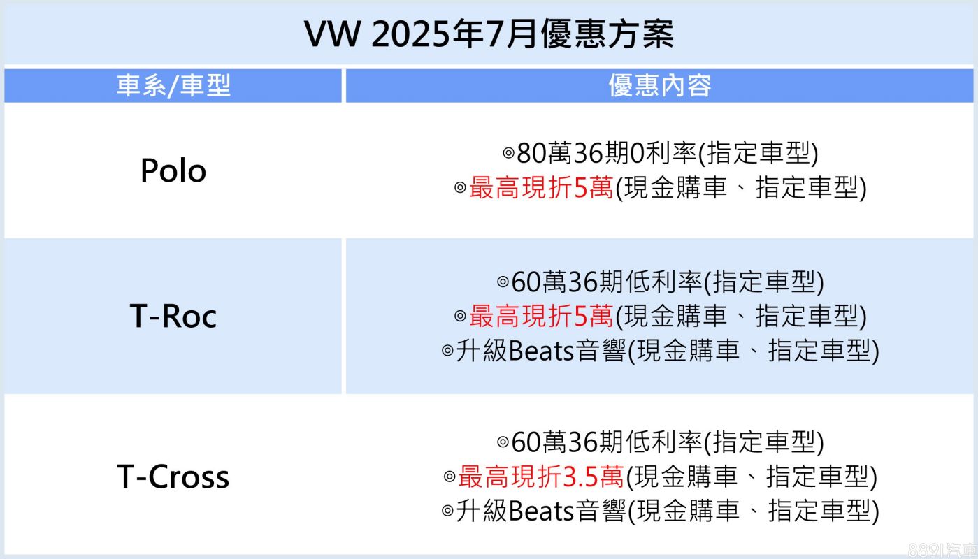 7月底前入主VW Polo指定車型,最高享50000元現金折扣,而同屬小型都會車系的T-Cross與T-Roc,指定車型購車再升級Beats環繞音響系統!另有高額分期低利率方案可適用,立即獲取分期方案>>