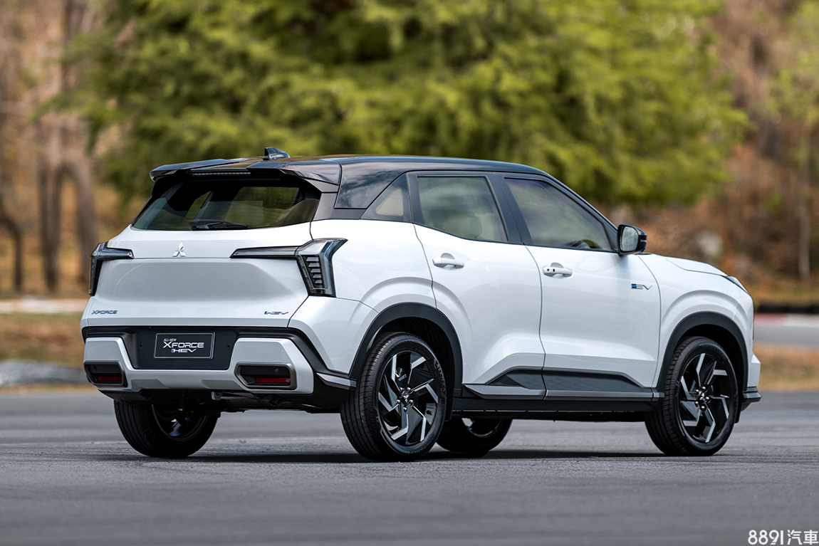 三菱XForce外型延續Dynamic Shield家族語彙,採用高車頭、大面積水箱護罩與T型LED頭燈,車側輪弧明顯外擴,營造出越野風格的跨界視覺。車尾同樣具有稜角設計,尾燈採用T字造型呼應車頭,並配備高位置剎車燈與車頂行李架。