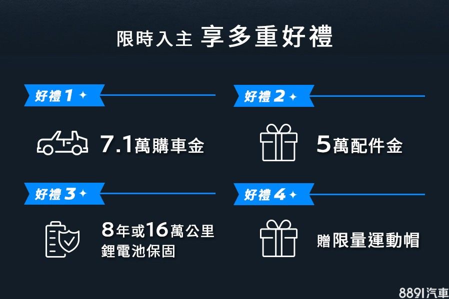 此外,本月底前入主,再享限時購車優惠,原廠直接提供價禮嗨購車金7.1萬元外,再加贈5萬元配件金,以及鋰電池8年或16萬公里保固,另加碼郭泓志YouTube頻道LOGO限量運動帽,還適用政府貨物稅減徵補助方案10萬元!