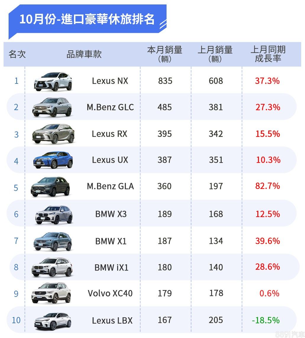 先前熱度極高的Lexus LBX,在10月份的蜜月期似乎稍稍降溫,經歷了-18.5%的最大衰退。雖然其長期表現依舊亮眼,但單月的衰退可能反映了初期新車效應趨緩,或是受到市場配額、交車時程波動的影響。