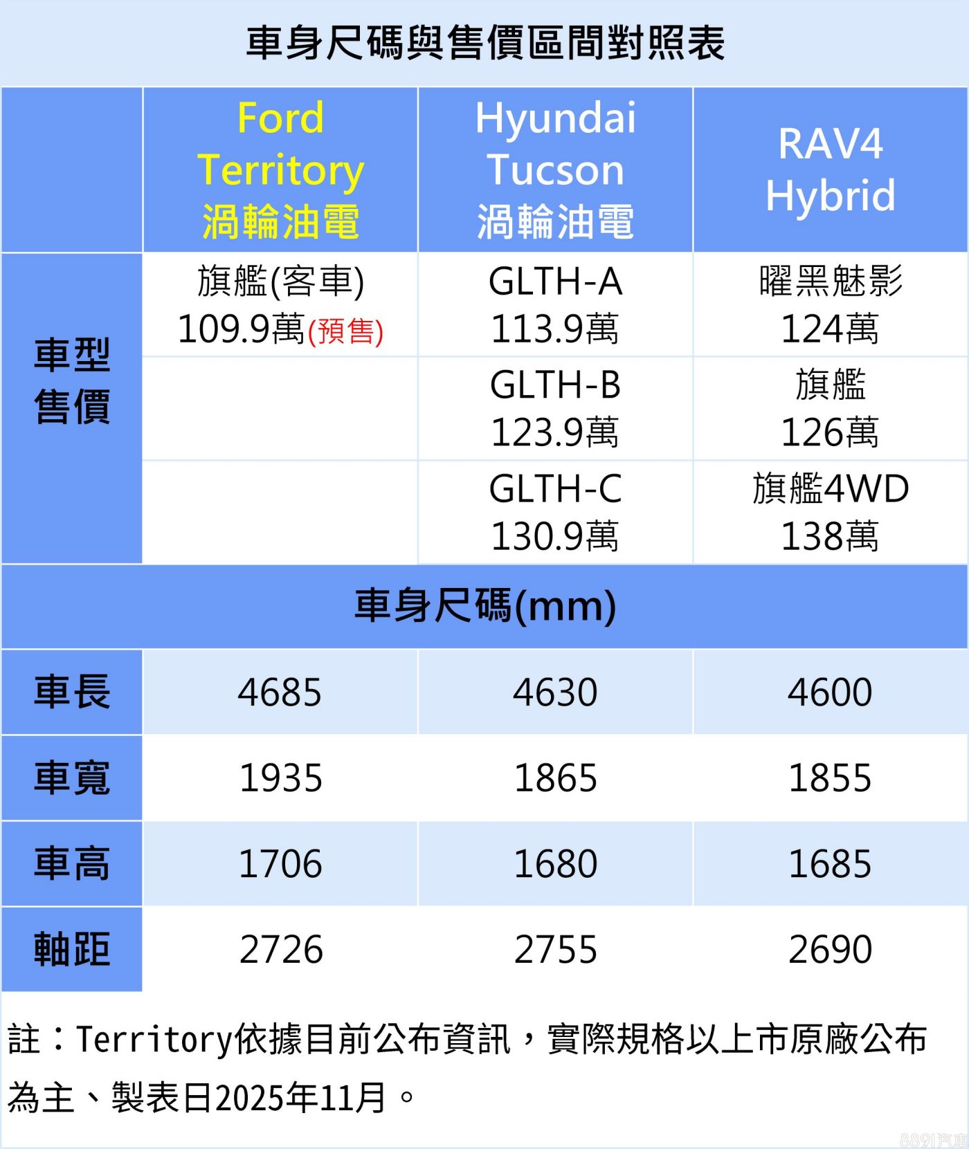 目前國內熱門中型SUV,尤其是國產身分的產品,依舊以小排量渦輪為主流,Ford Territory的出現可謂在這場戰役中,揮出了亮眼的第一棒,主打「油電」動力、百萬出頭的價位,初步看來賣點不小,其定位與配置,直接將矛頭對準同為國產的Hyundai Tucson Turbo Hybrid,以及進口車國產價的霸主Toyota RAV4 Hybrid,Territory到底能不能成為新的福特頂梁柱?甚至是國民油電中型休旅新黑馬?還是得看其產品力是否夠全面。