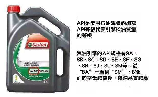 看API等級代碼,API是美國石油學會的英文縮寫,API等級代表引擎油品質的等級。API引擎油分為兩類:"S"開頭系列代表汽油引擎用油;"C"開頭系列代表柴油引擎用油。