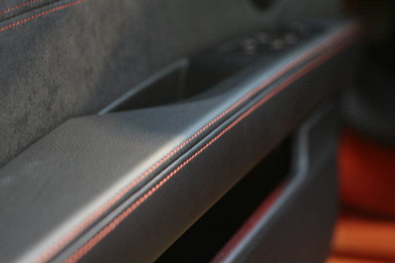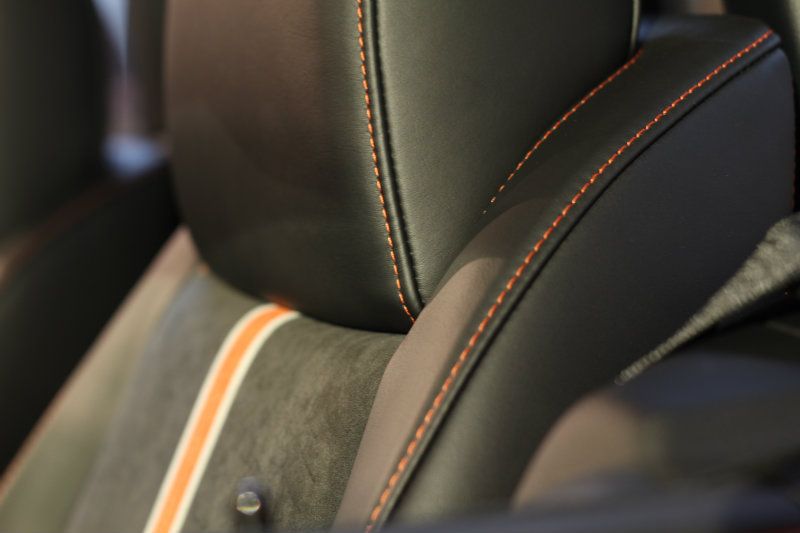 麂皮/真皮混搭的座椅材質是Design Pure Traction配備之一,包含在內的橘色縫線與鋁質飾板讓車室空間不再暗沈。
