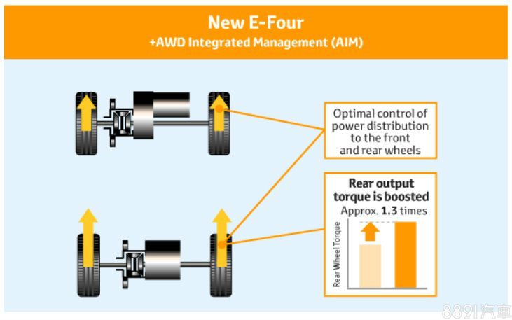 新的AWD和E-Four 4WD系統,是分別針對汽油及混合動力車型所開發,前者能適時調配各驅動輪之扭力輸出,並在無需使用四輪驅動時可將動力僅傳輸至前輪,變為2WD模式;後者則能強化後輪扭力輸出達30%(與現行版本相比)。