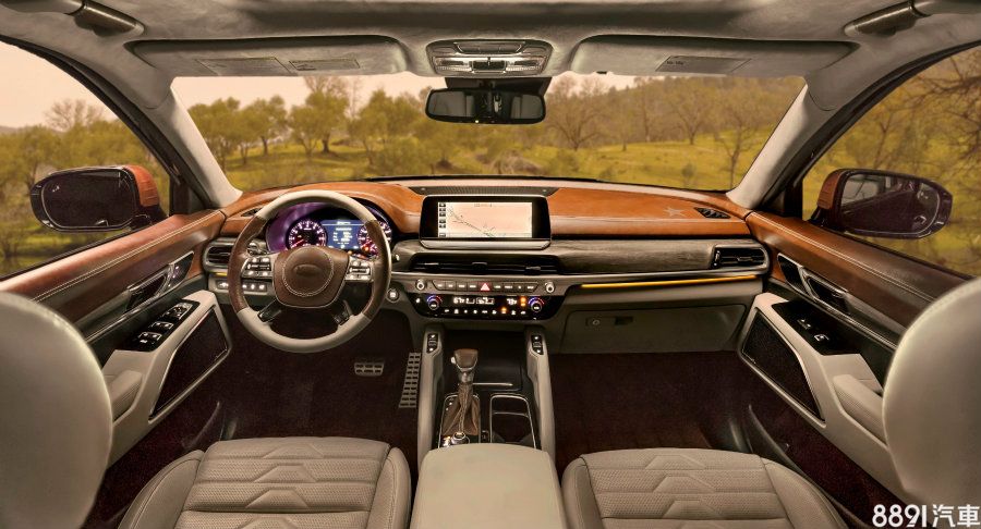 車室沿襲Telluride Concept之元素,採大量水平線條營造視覺寬闊度,配置數位儀錶與大尺寸中控螢幕增添科技感,並加入木質、皮革用料,以呼應外觀的獨特。