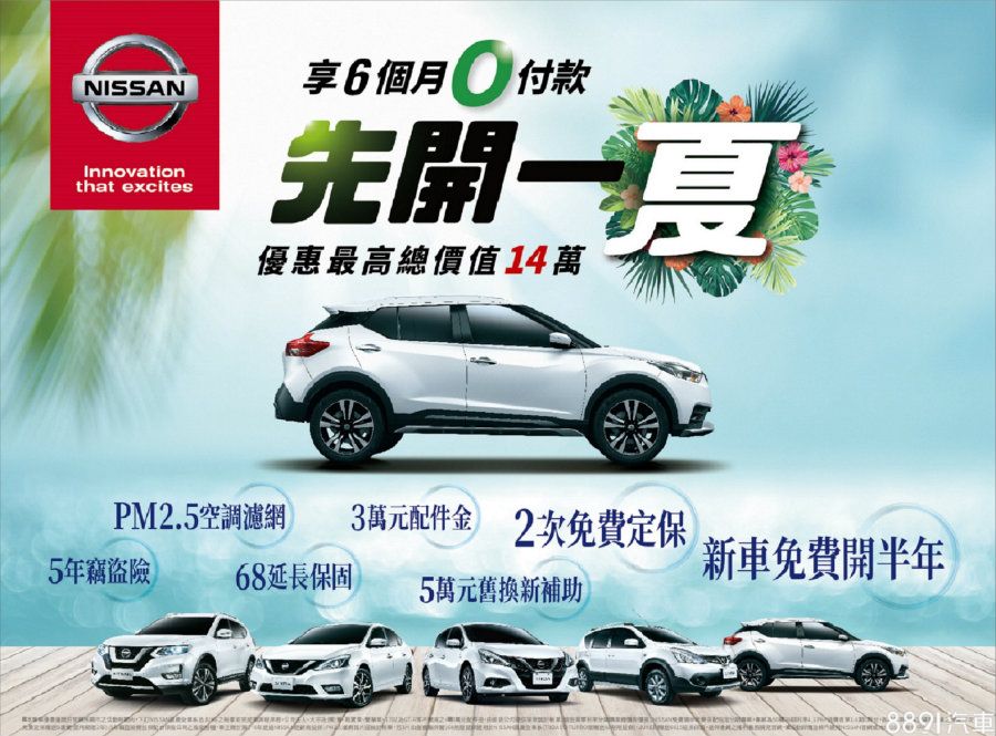 本月「先開一夏」購車方案繼續火熱展開,即日起至7/31,凡下訂國產全車系及Juke並完成領牌,且配合指定分期專案,立即享有前6個月0付款,另外還有3萬元配件金、延長保固、2次免費定保、5年竊盜險以及加贈PM2.5空調濾網等優惠。