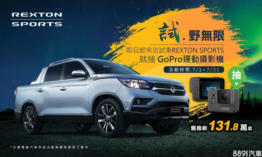 自即日起至7/31,凡購入Rexton Sports 2.2柴油豪華型4WD,除提供舊換新131.8萬起,還有5年10萬公里原廠保固,若參加體驗試乘,更有機會抽中GoPro運動攝影機。
